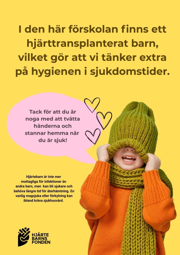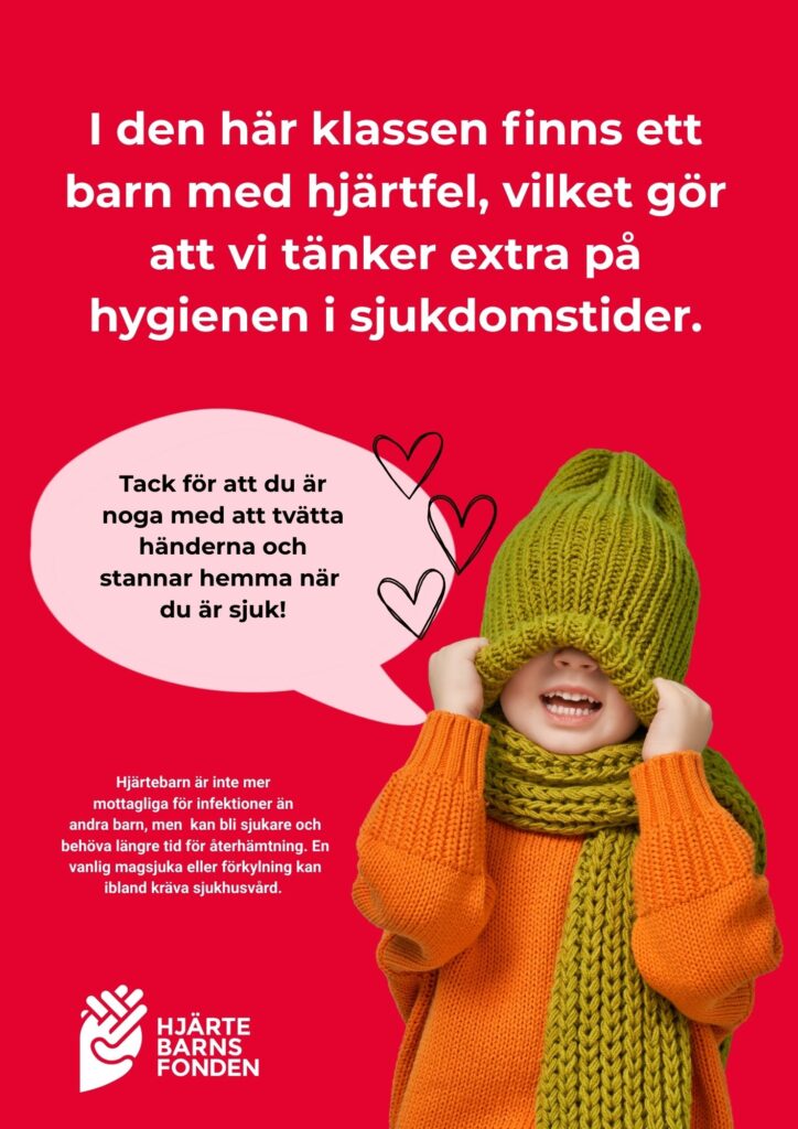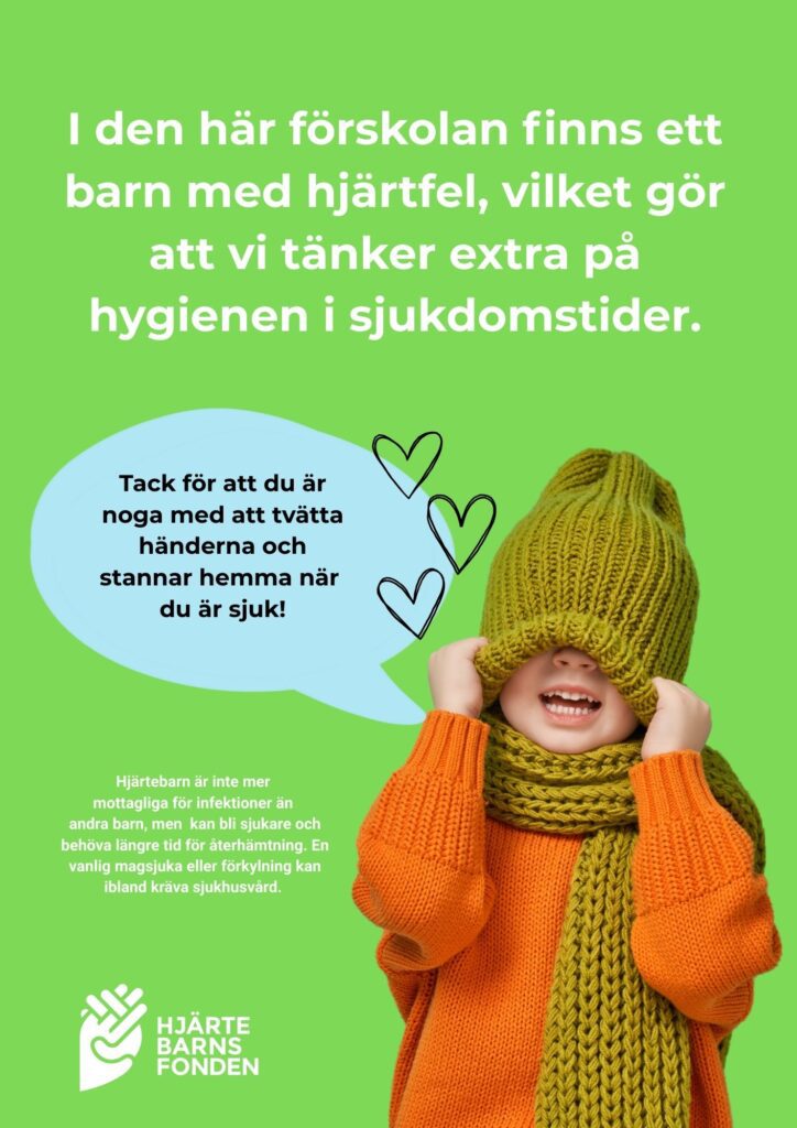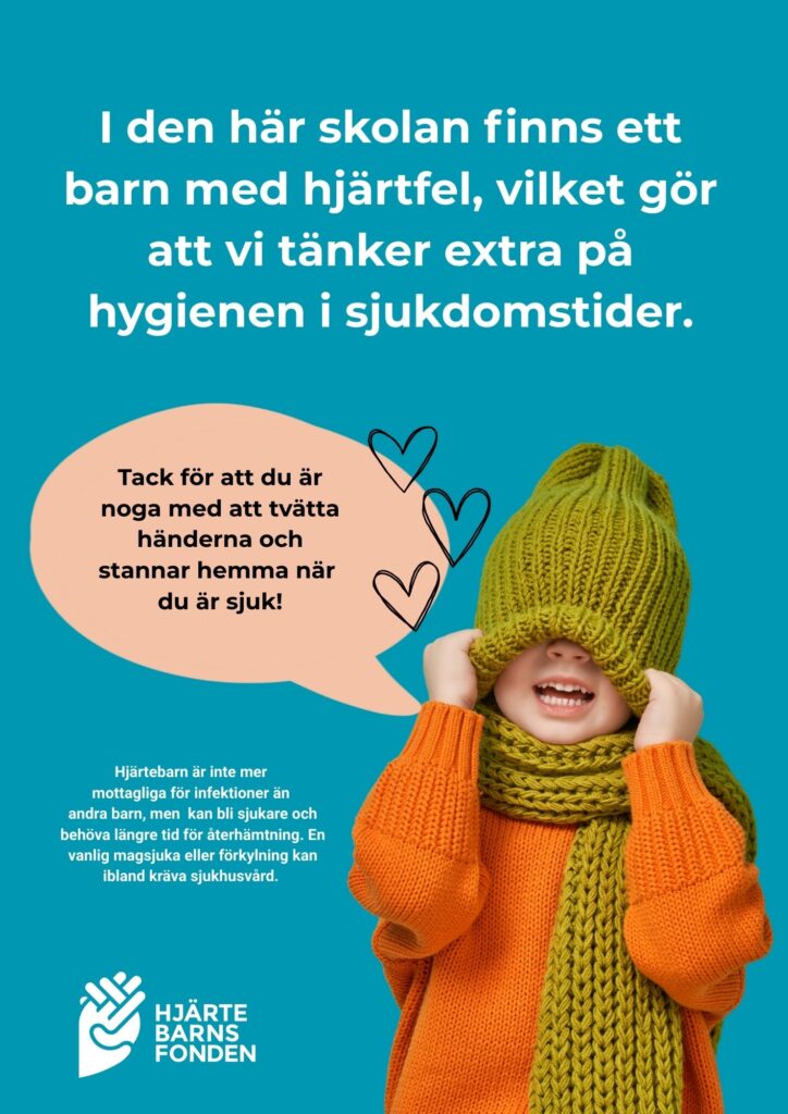 Vi vill göra skolgången tryggare och enklare för barn med hjärtfel. Därför har vi tagit fram en broschyr med information och tips till dig som är förälder, samt en A4-affisch för skolan som påminner om hur viktigt det är att hålla god hygien under sjukdomstider.